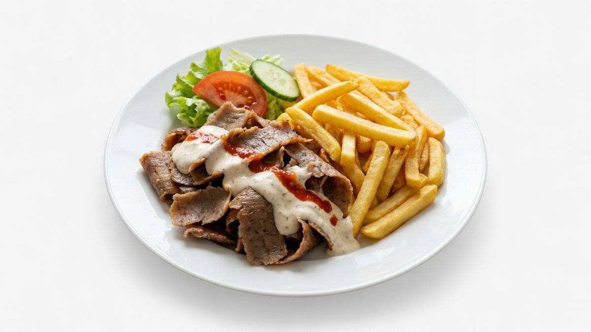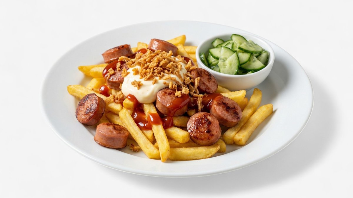 Makkaraa, ranskanperunoita, kurkkusalaattia, valkosipulimajoneesi, ketsuppia, paahdettu sipuli.