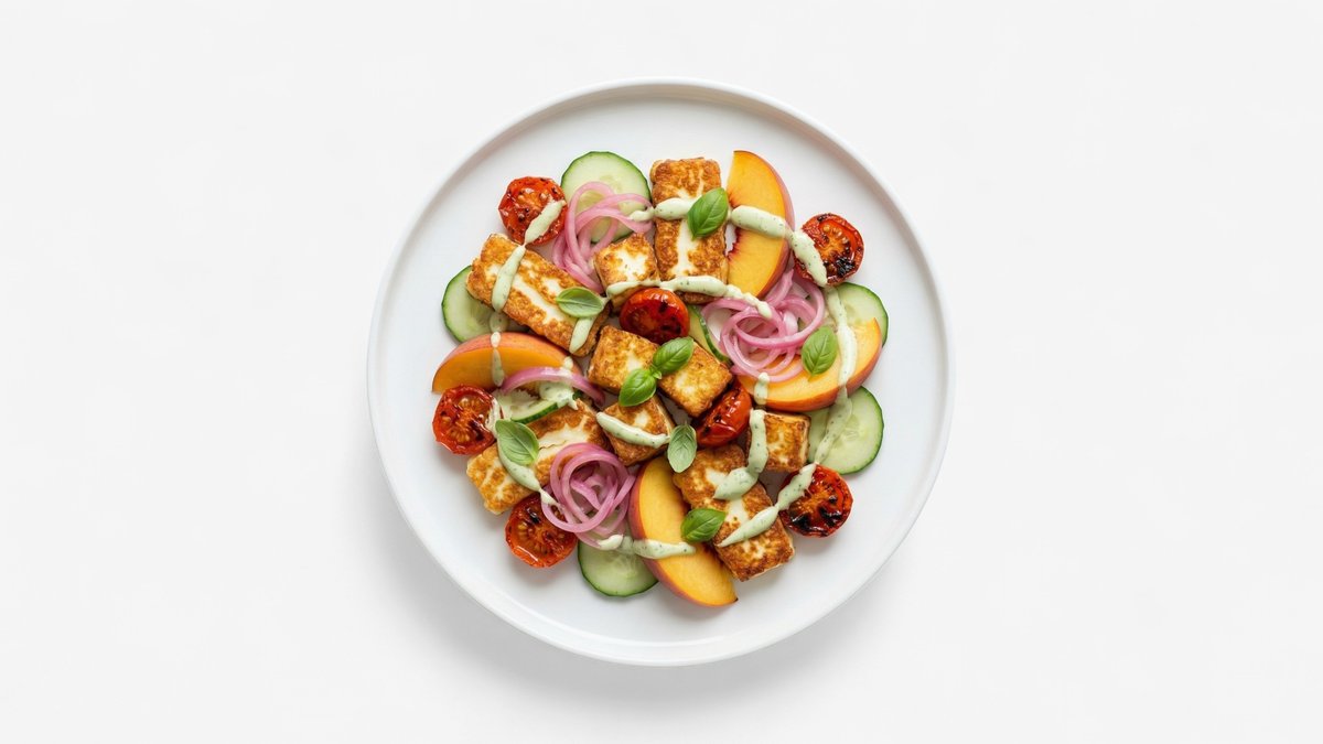 Friteerattua halloumjuustoa, marinoitua punasipulia, paahdetut kirsikkatomaatit, kurkkua ja persikka basilikamajoneesia
