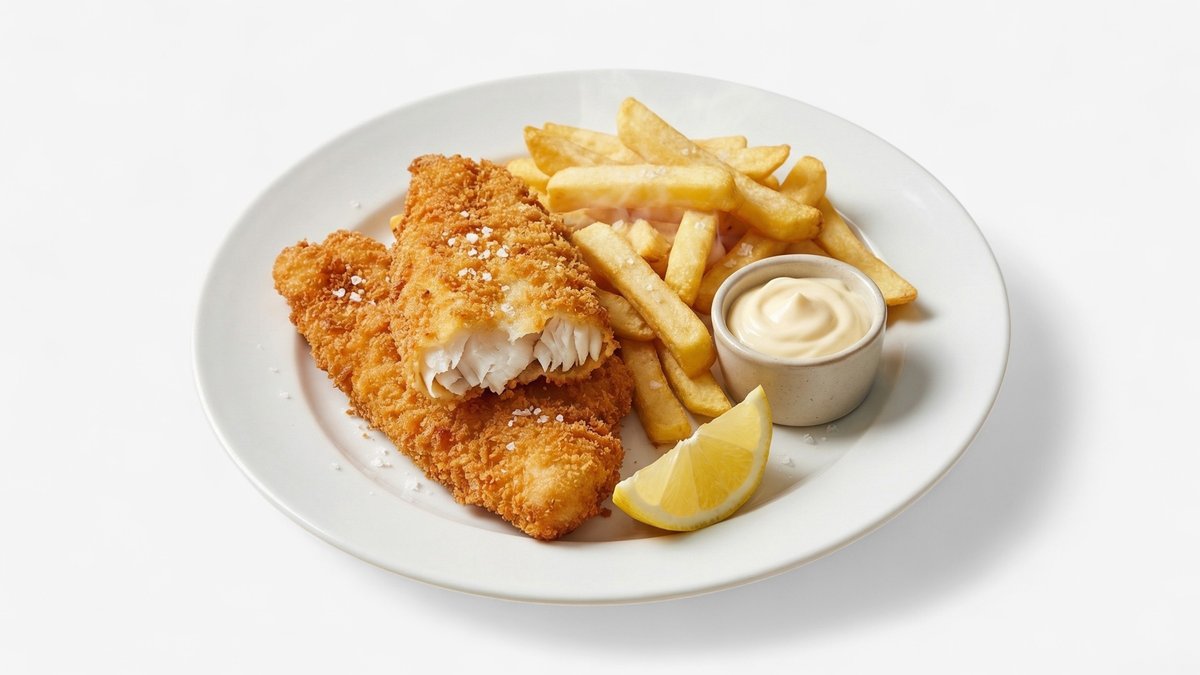 Paneroitua kalaa ja ranskalaisia, oma valinta majoneesi.