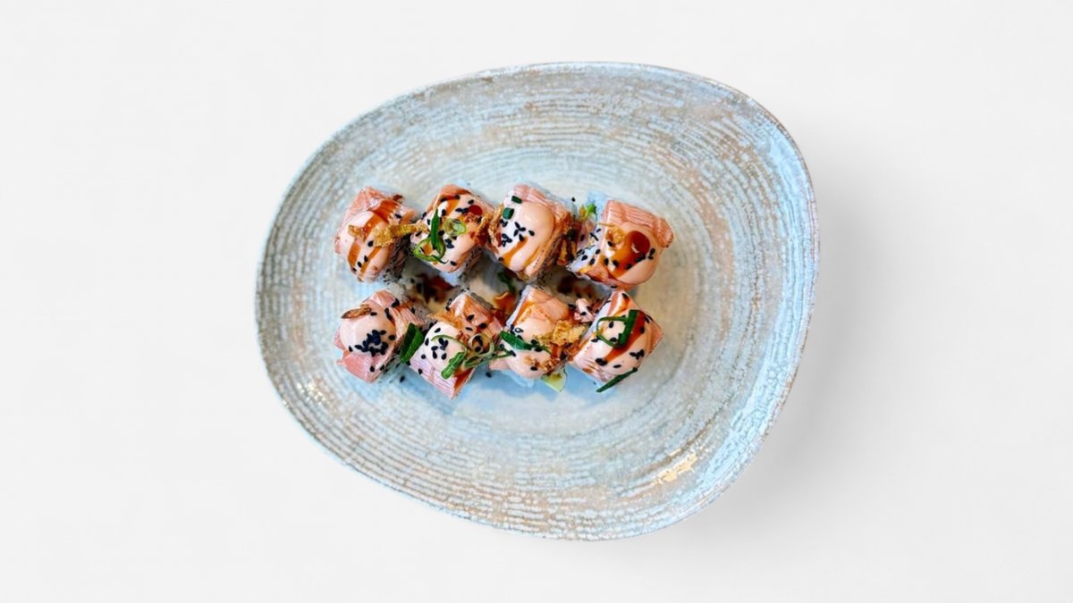 Salmon, cucumber, avocado norimaki topped with flamed salmon, mayo, sweet soy sauce, kimchi sesame, spring onions