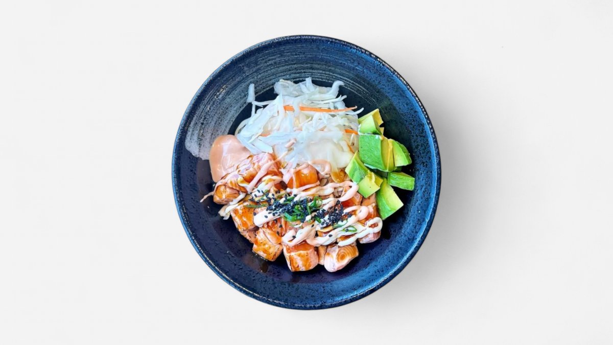 Grilled salmon, rice, cabbage salad, cucumber, avocado, green onion, sesame seed, home -made mayo, dried onion, truffle sauce