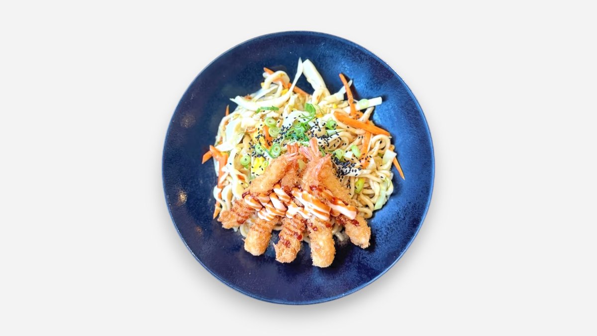 Fried tiger shrimp with stir wok udon with cabbage, carrot, spring onion, sesame seed, home -made mayonnaise, sweet soy sauce