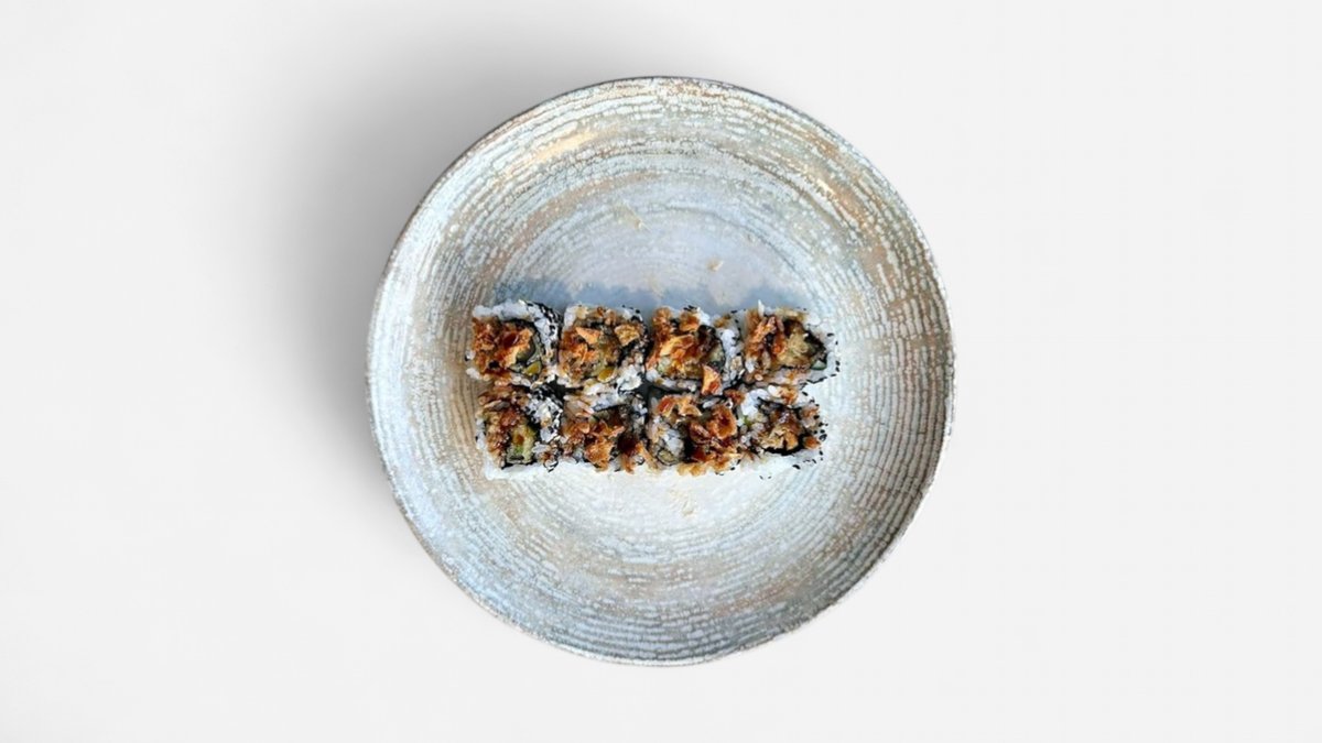 Deep-fried shrimp and avocado norimaki, topped with crabstick tartare, spring onion and sweet soy sauce
