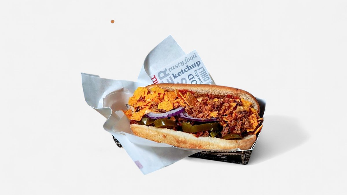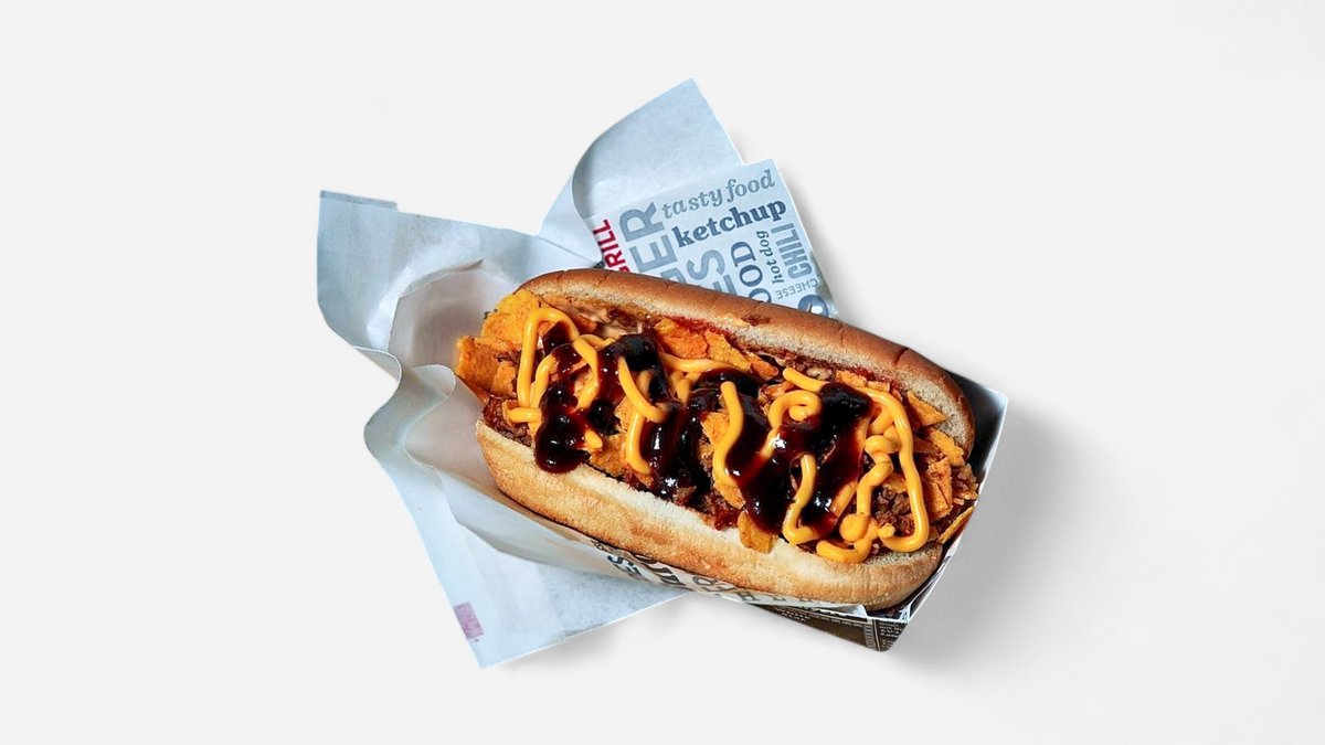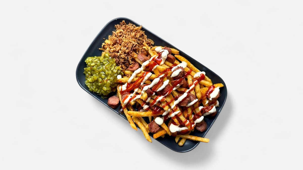 Sausage, fried onions, pickles, cheese sauce, bbq sauce, jalapeños, crushed french fries hodog