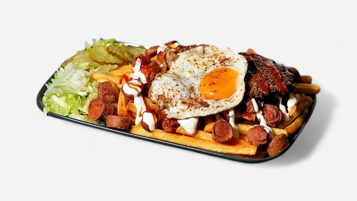 French fries, whole-meat steak, sausage, fried egg, salad, pickled cucumber