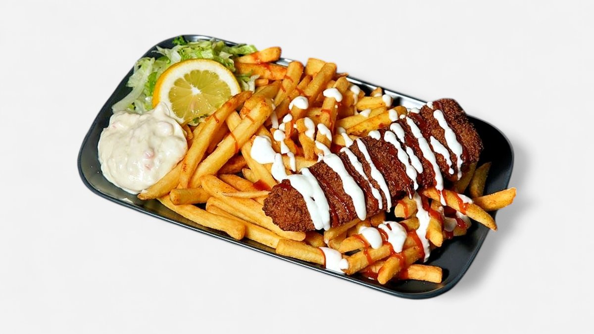 Crispy fish fillet fried until golden brown 120 g, french fries, tartar sauce