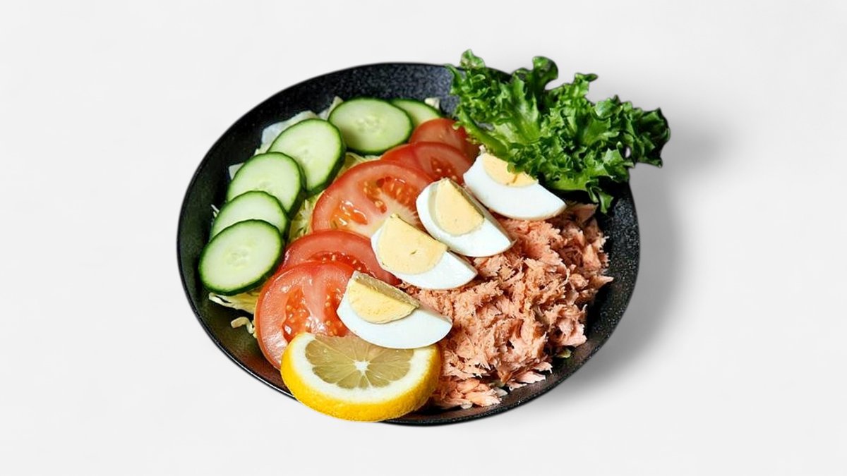 Salmon, cucumber, tomato, lettuce, boiled egg & lemon