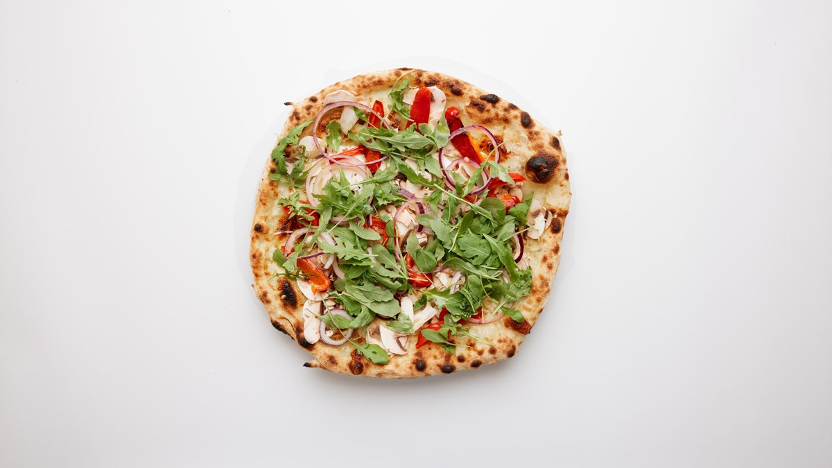 Mozzarellajuusto, herkkusieni, punasipuli, paprika, rucola