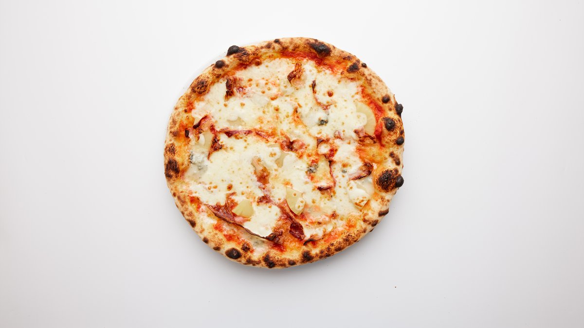 Tomaattikastike, mozzarellajuusto, italialainen pekoni, gorgonzolaa, ananas