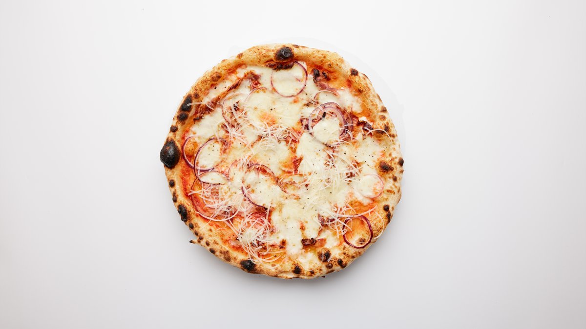Tomaattikastike, mozzarellajuusto, italialainen pekoni, parmesaani, punasipuli, mustapippuri