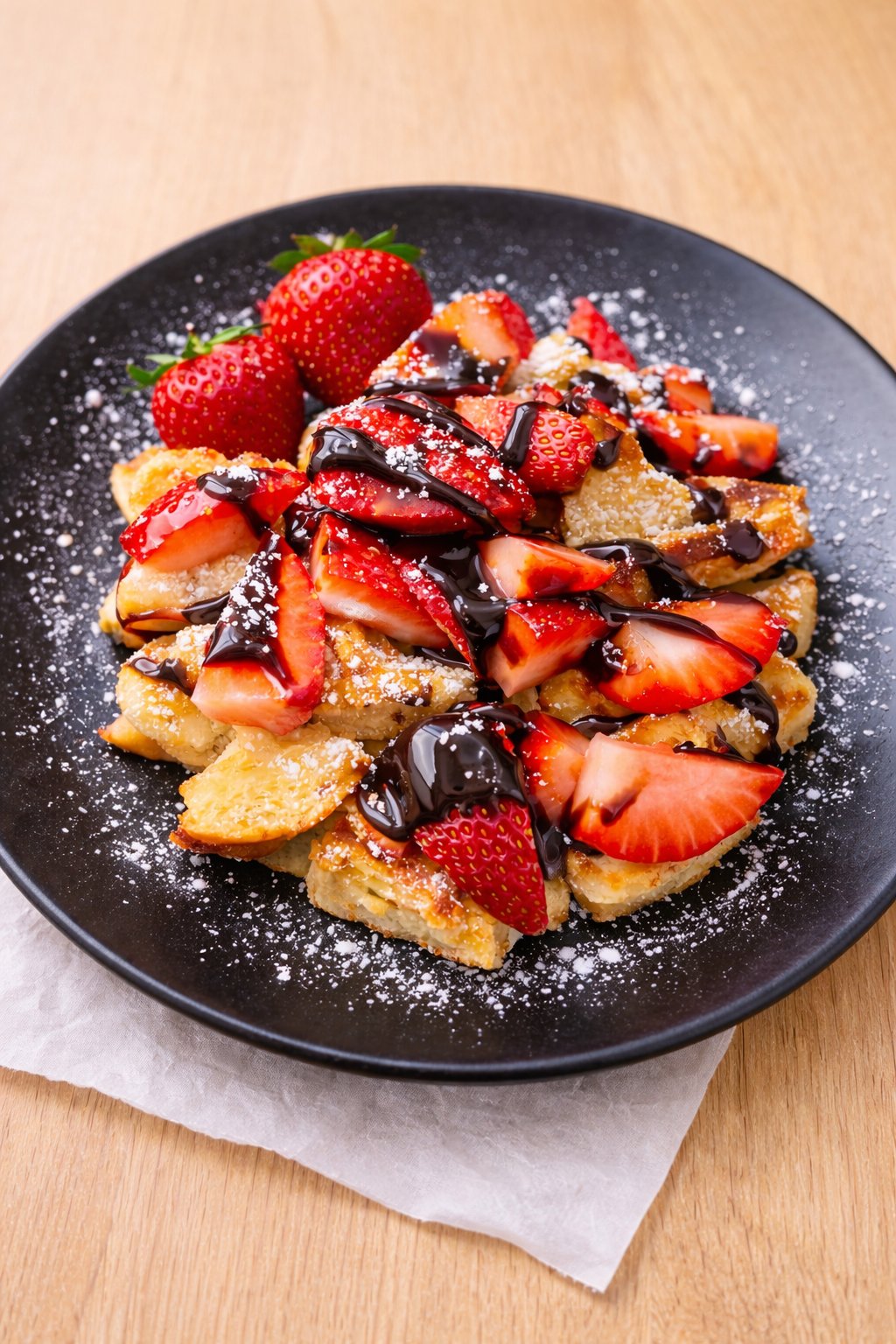 Rapeaksi paahdettu belgialainen vohveli leikattuna herkullisiksi paloiksi, tarjoiltuna tuoreiden mansikoiden ja täyteläisen suklaakastikkeen kanssa. Viimeistelty kevyellä tomusokerihunnulla – täydellinen makea herkku!