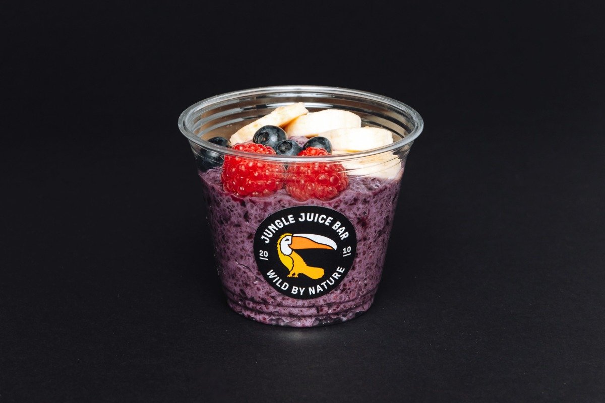 luomu chia, suomalainen metsämustikka, kookos, pensasmustikka, vadelma, banaani, agavesiirappi, L,G,Ve