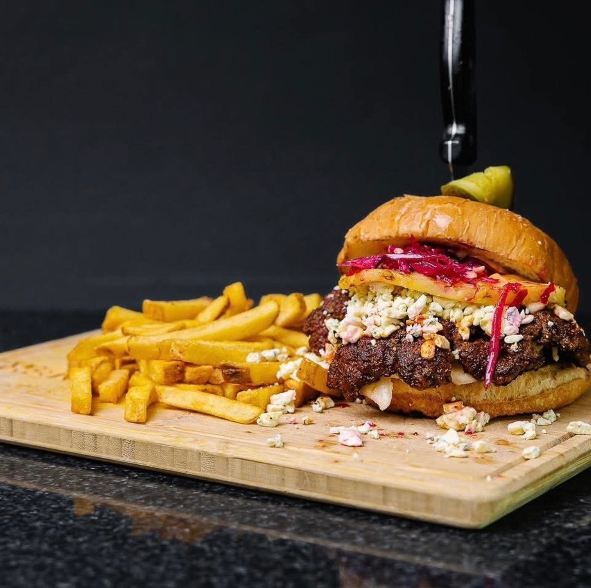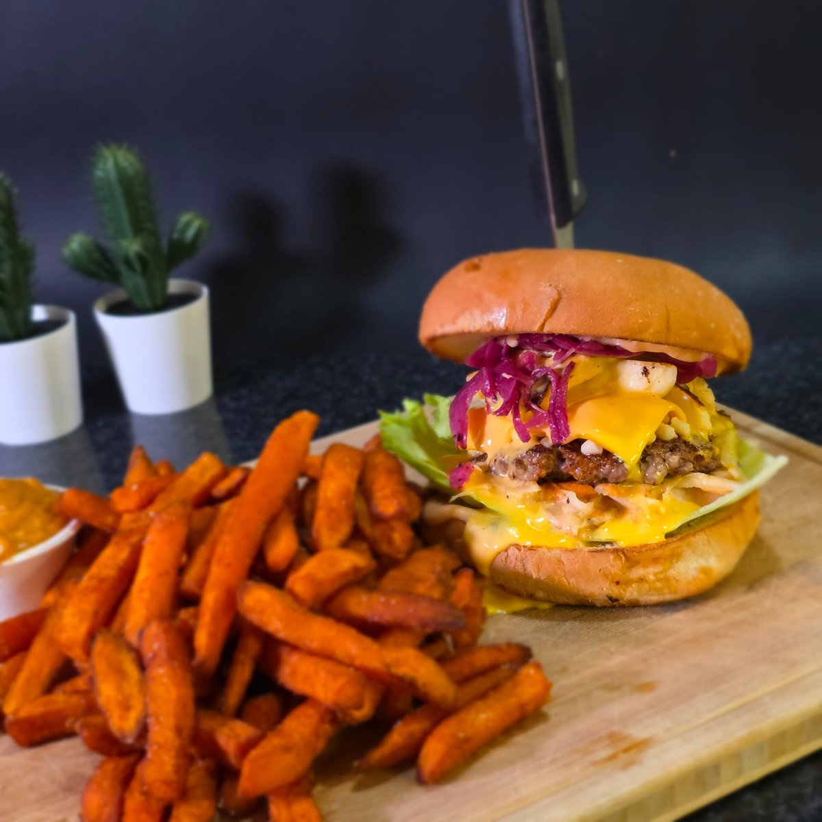 Iso smash-naudanlihapihvi, sipuli-jalopeno paistos, tulinen chilikastike, pariloitua tuoretta ananasta. Sisältää myös punasipulia, coleslawia, salaattia, Mikes BBQ- kastiketta, valkosipulimajoneesia ja suolakurkkua.