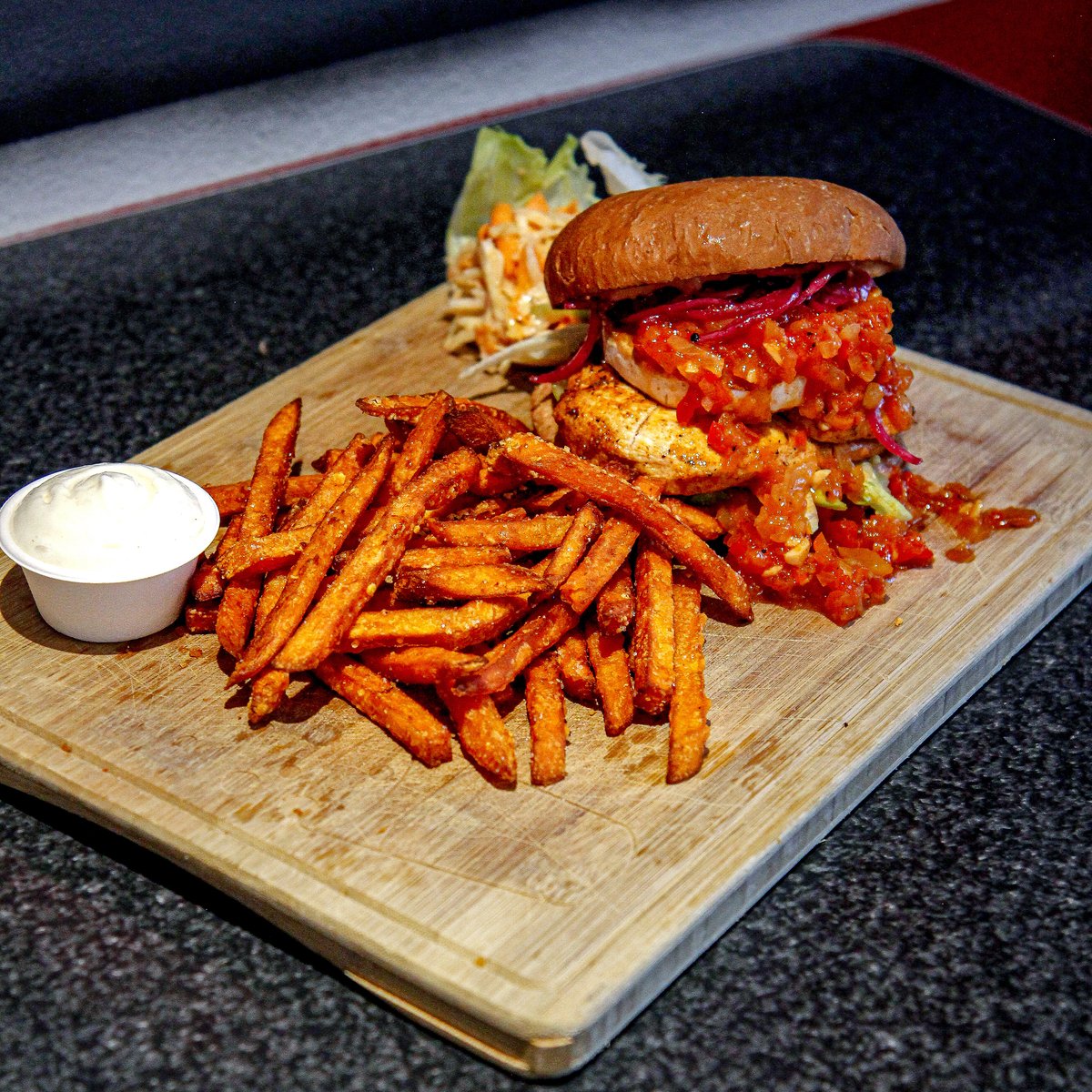 Rapea kasvipohjainen chicken-style pihvi, chilitofua ja chilimajoneesia. Sisältää myös punasipulia, coleslawia, salaattia, Mikes BBQ- kastiketta, valkosipulimajoneesia ja suolakurkkua.