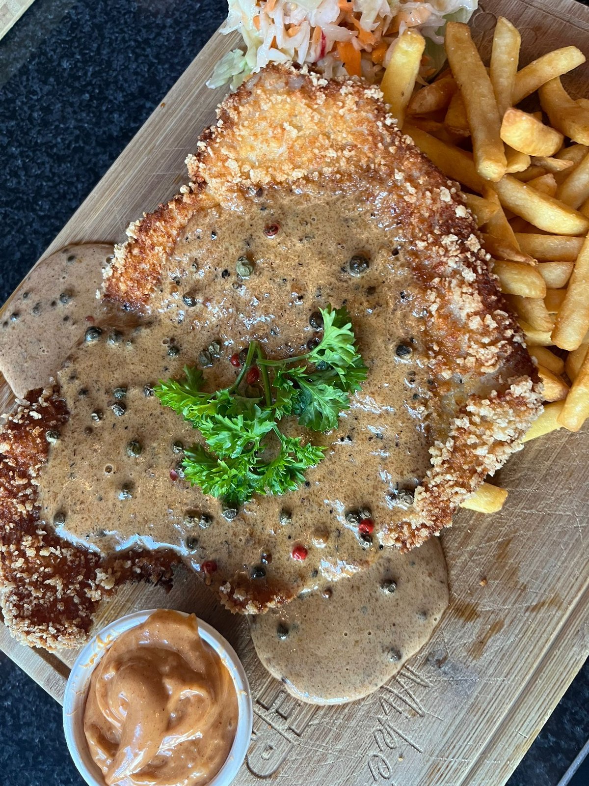 Paneroituja kananfileitä, ranskalaisia, bbq-ananasta, currymajoneesia, talon coleslaw.