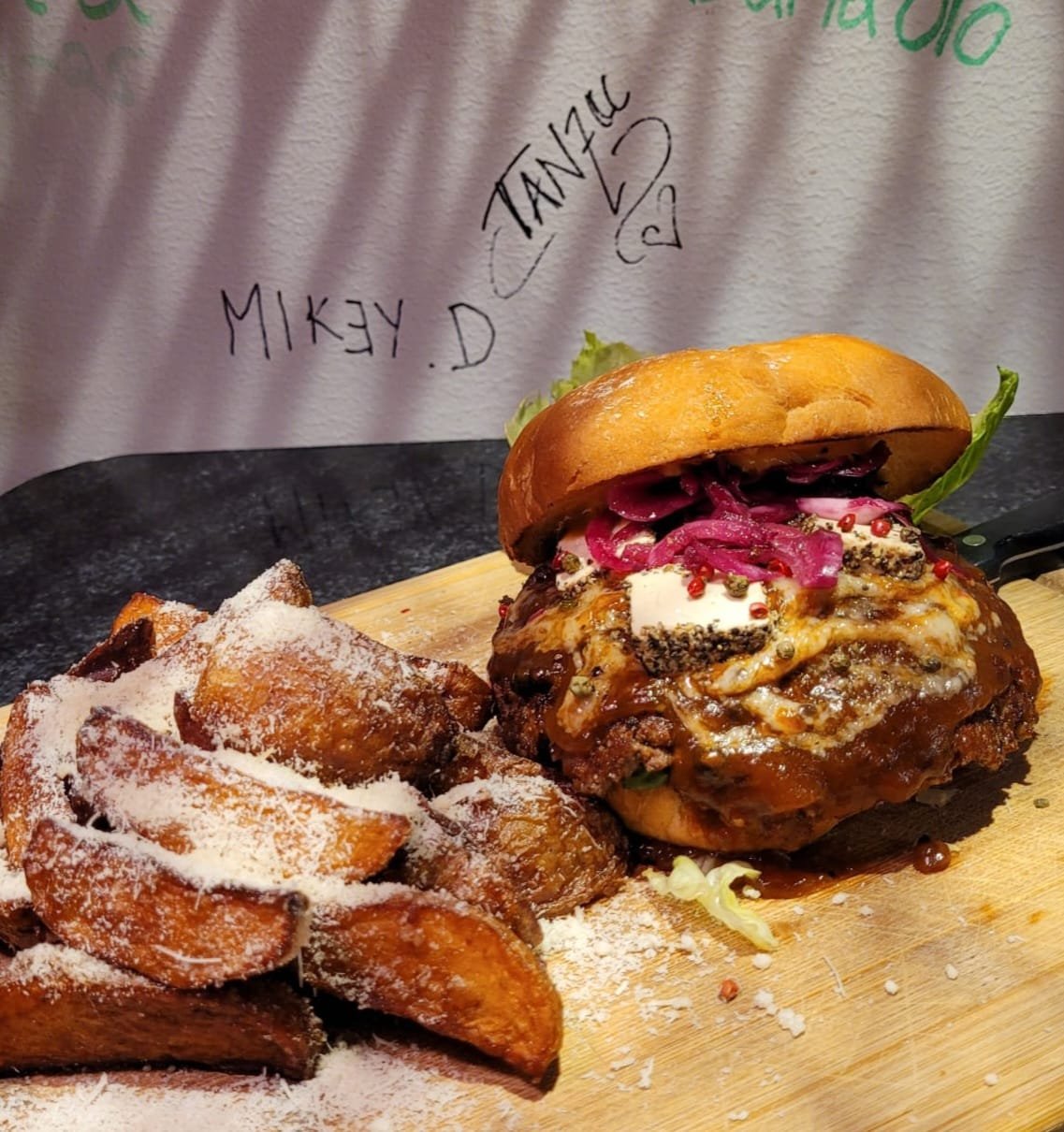 Iso smash-naudanlihapihvi, pippurijuustoa, kolmen pippurin kastiketta, valkosipulia. Sisältää myös punasipulia, coleslawia, salaattia, Mikes BBQ- kastiketta, valkosipulimajoneesia ja suolakurkkua.