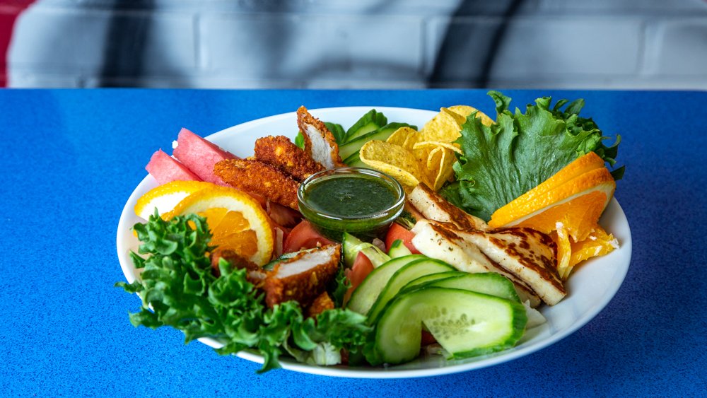 Green steak, avocadomajoneesi, chilitofua, pesto stripes ja tomaattia. Sisältää myös punasipulia, coleslawia, salaattia, Mikes BBQ- kastiketta, valkosipulimajoneesia ja suolakurkkua.