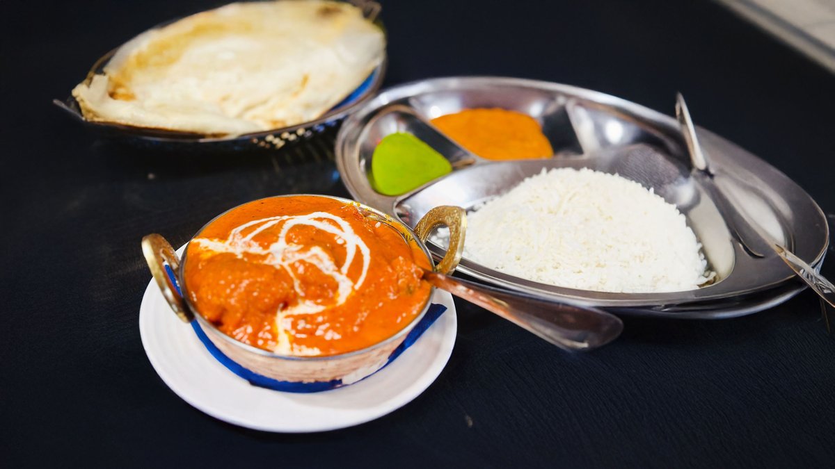 Tandoori-fried pieces of chicken fillet in a tomato-butter-cream sauce. As a side dish, rice or french fries. The portion also includes naan bread and raita.