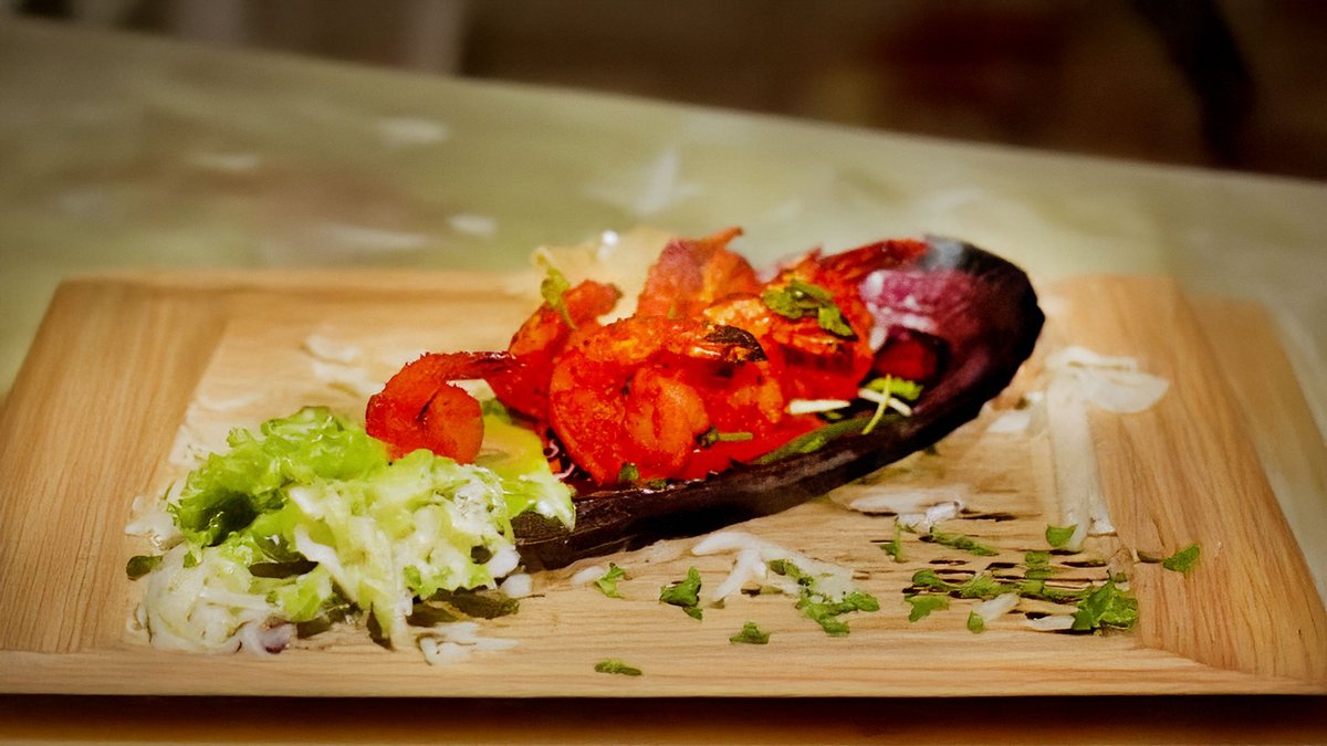 Giant prawns marinated in yogurt and grilled in a tandoor oven, onions and peppers in a tomato-yogurt sauce