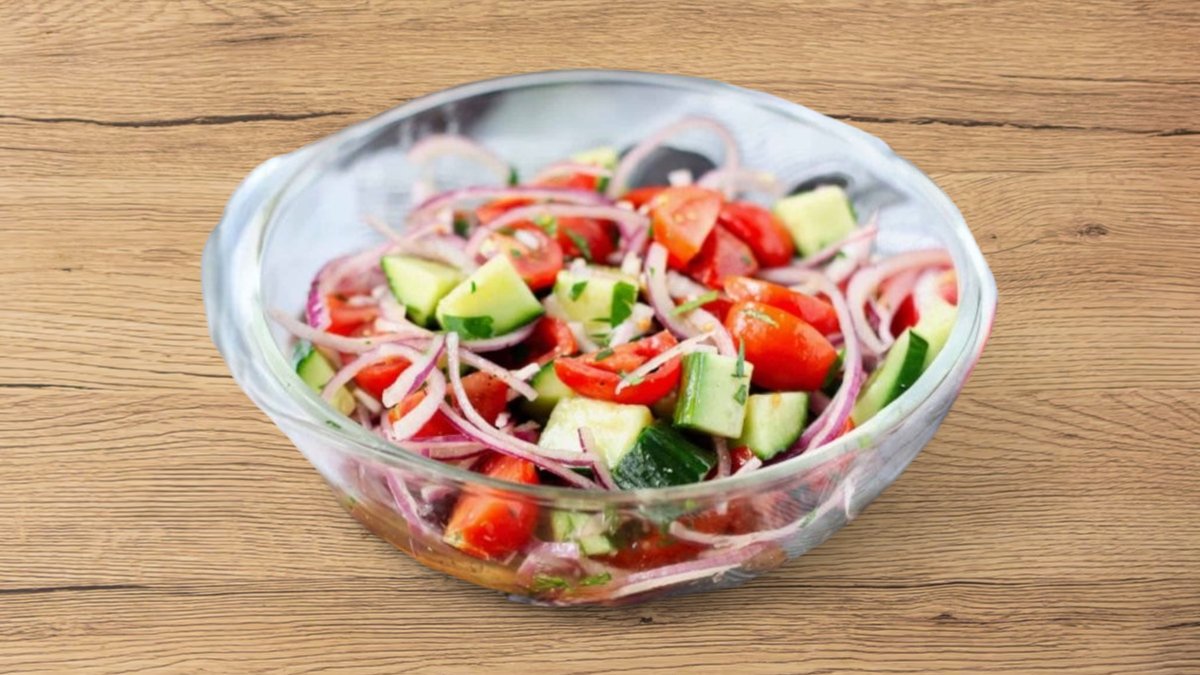 Summer salad: Tomatoes, cucumbers, red onions, olive oil