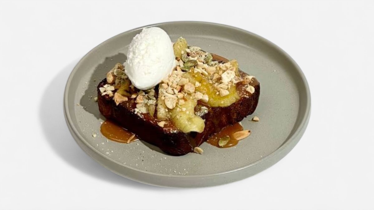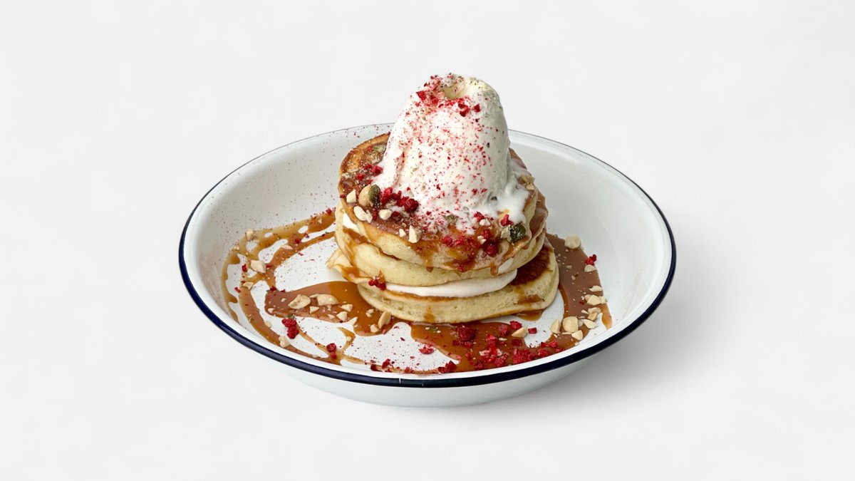 Pancakes, banana, peanuts, salted caramel, cream cheese, ice cream