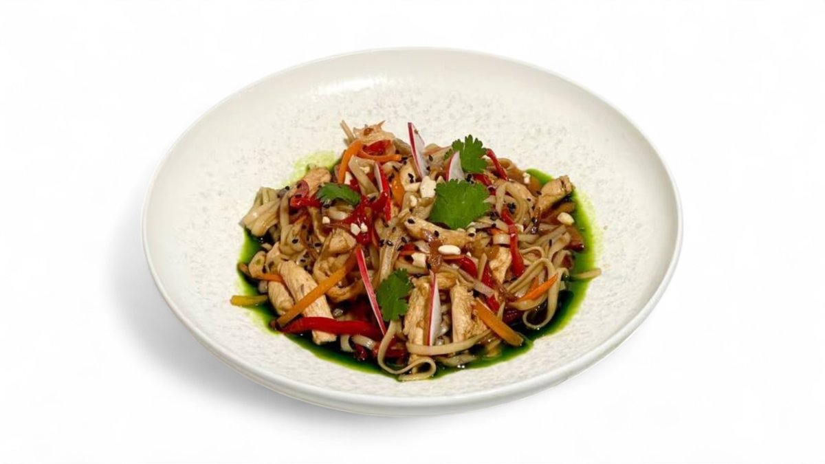 Udon, egg, chicken, onion, carrot, salt, pepper