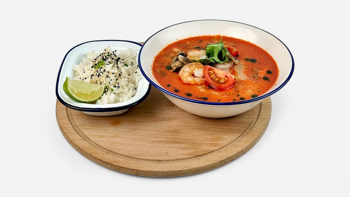 Shrimp, mushrooms, fish sauce, coconut cream, curry paste, rice, sesame, cilantro, salt, pepper