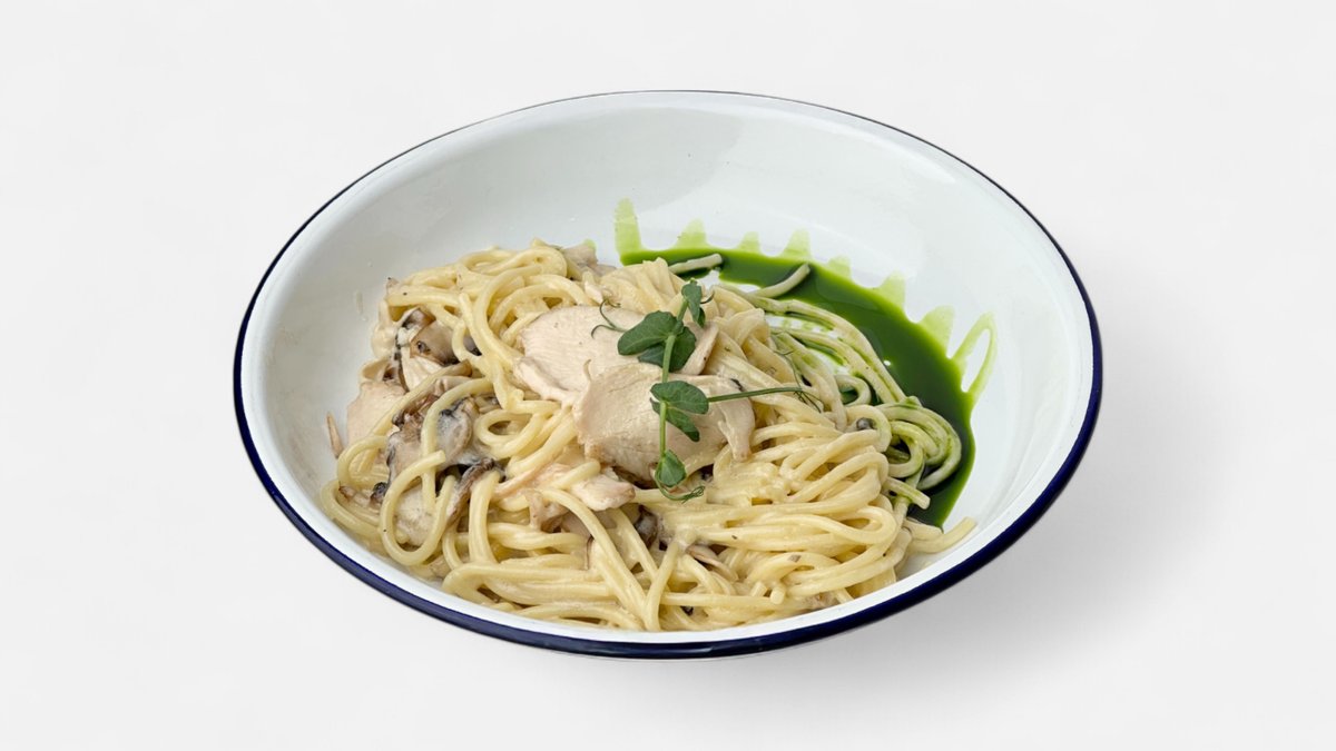 Spaghetti, cream, bacon, parmean, garlic, egg