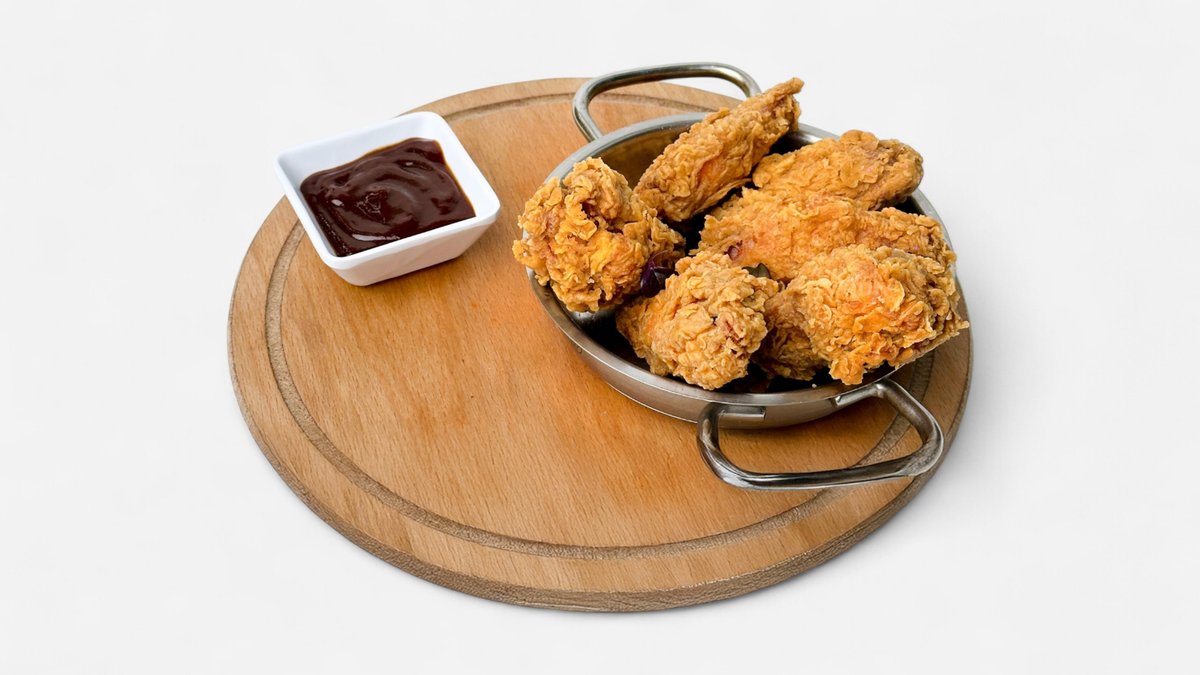 Chicken wings, flour, starch, paprika, salt, oil, ketchup