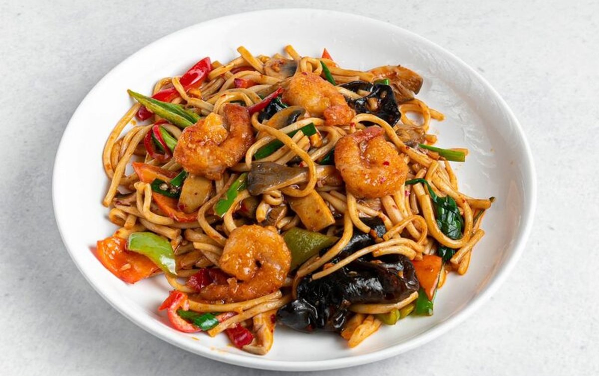 Homemade Noodles Stir-Fried With Vegetables And Shrimps.