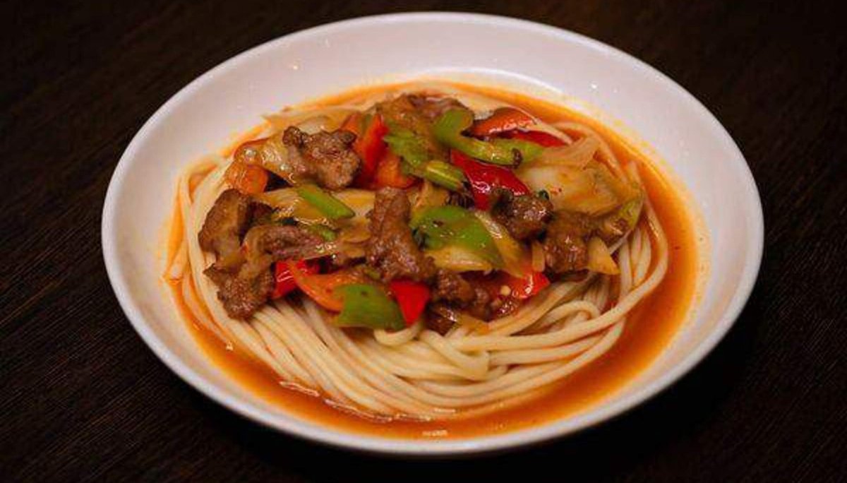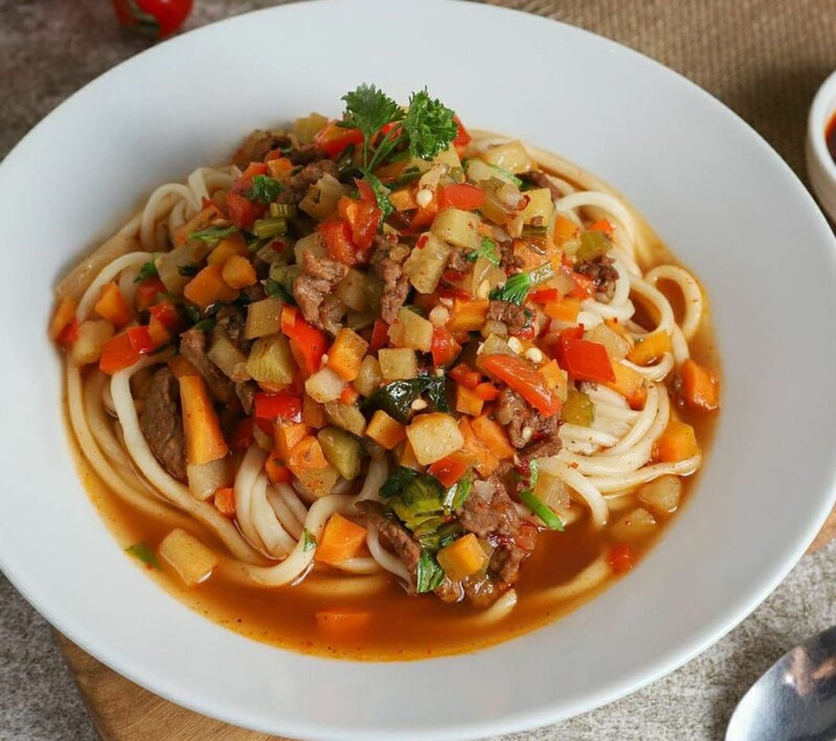 Homemade Noodles With Finely-Cut Vegetables And Beef