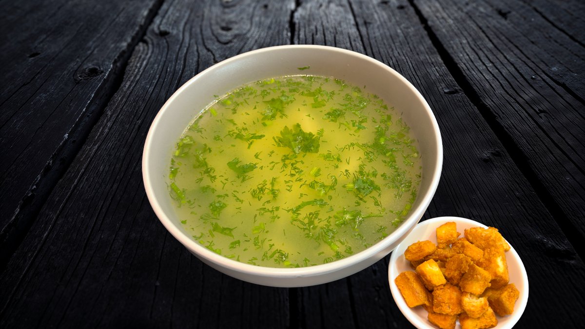 ქათმის ბულიონი მიირთმევა ცხლად, ნაზ ქათმის ფილესა და ხრაშუნა სუხარიკებით.