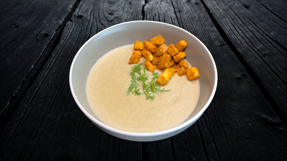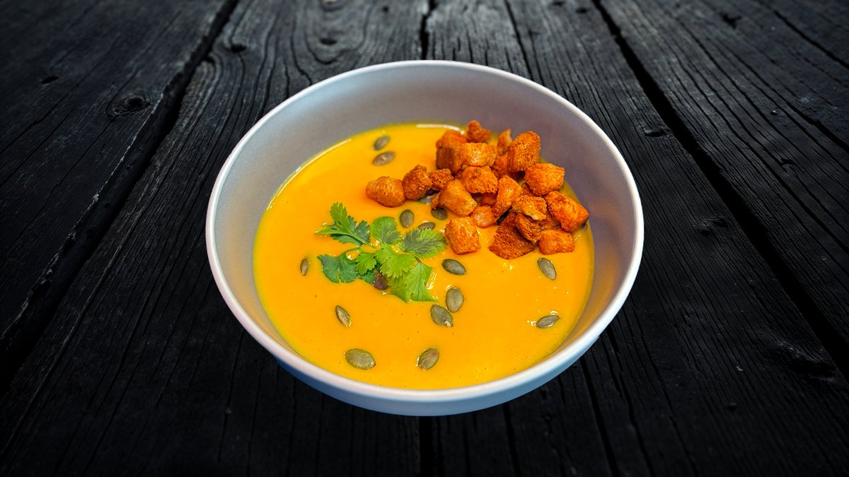 დელიკატური კრემისებური გოგრის წვნიანი გოგრის თესლის. ხრაშუნა ოქროსფერი კრუტონებით.