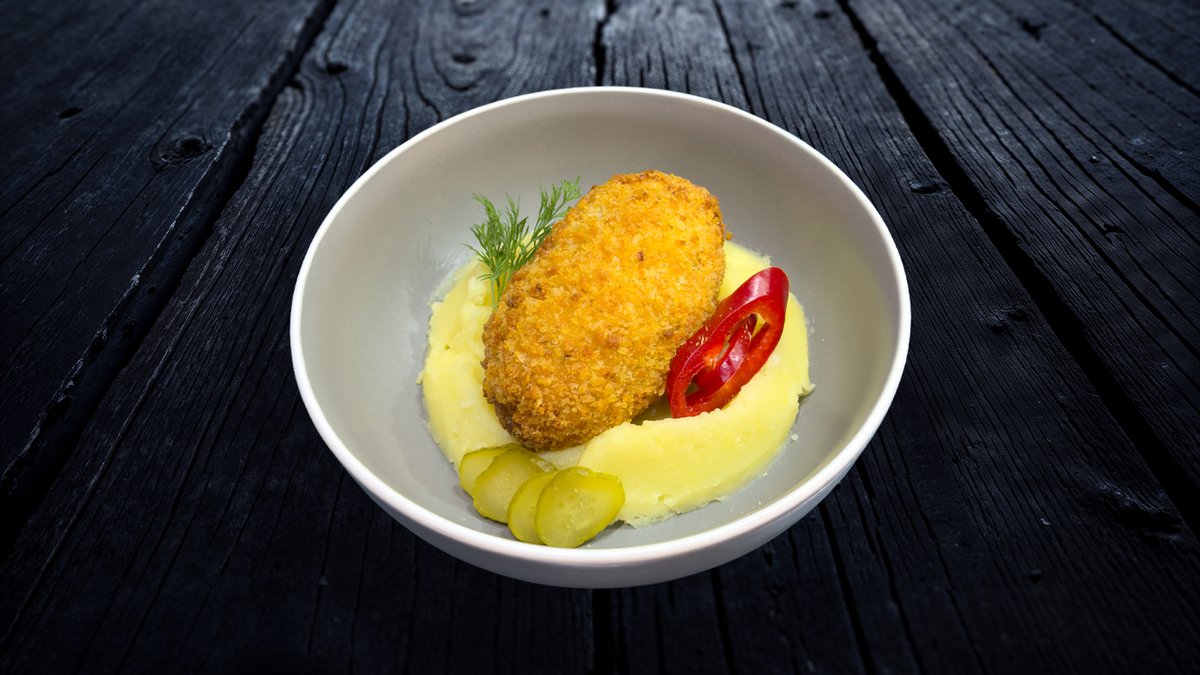 კლასიკური მსუბუქი კერძი, რომელიც შედგება ნაზი ქათმის კოტლეტისგან, რომელიც შემწვარია ოქროსფერი ქერქის მიღებამდე, და ჰაეროვანი კარტოფილის პიურედან.