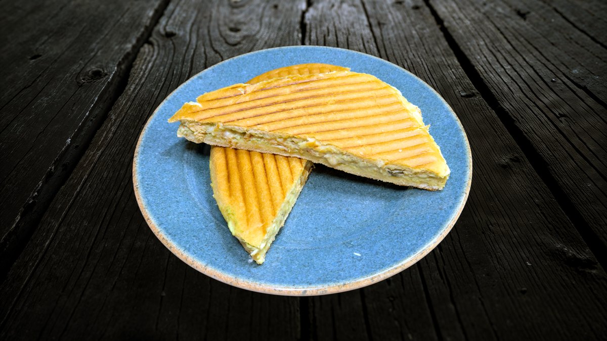 ცხელი იტალიური სენდვიჩი, სავსე წვნიანი ქათმის ფილით ნაღების სოუსში, კრემ-ყველი, პესტო და მაცარელა.