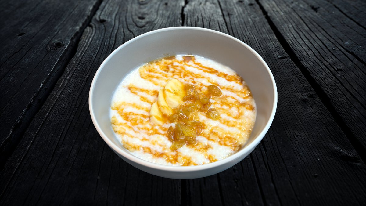 ბრინჯის წვნიანი, ბანანის ნაჭრებით, ყურძნის ჩირით და კარამელით. იდეალურია საუზმისთვის.