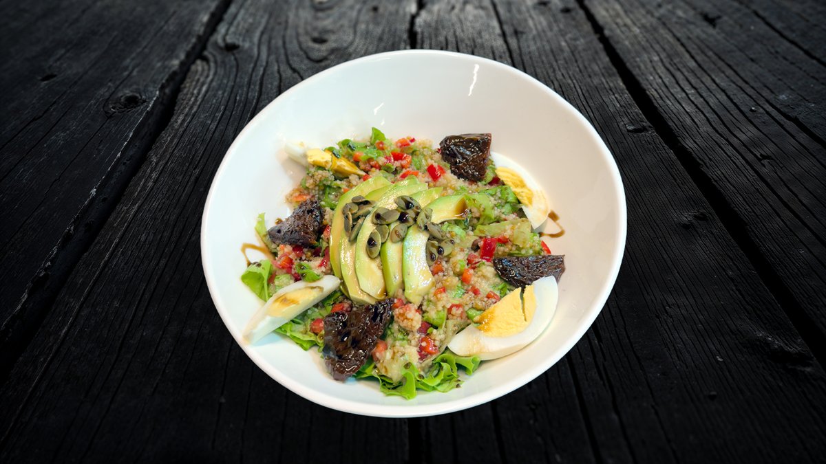მსუბუქი და სასარგებლო სალათი კუსკუსით, ნაზ ავოკადოთი და სუფთა ბოსტნეულით – იდეალური არჩევანი ჯანმრთელი წახემსებისთვის ან მსუბუქი სადილისთვის.