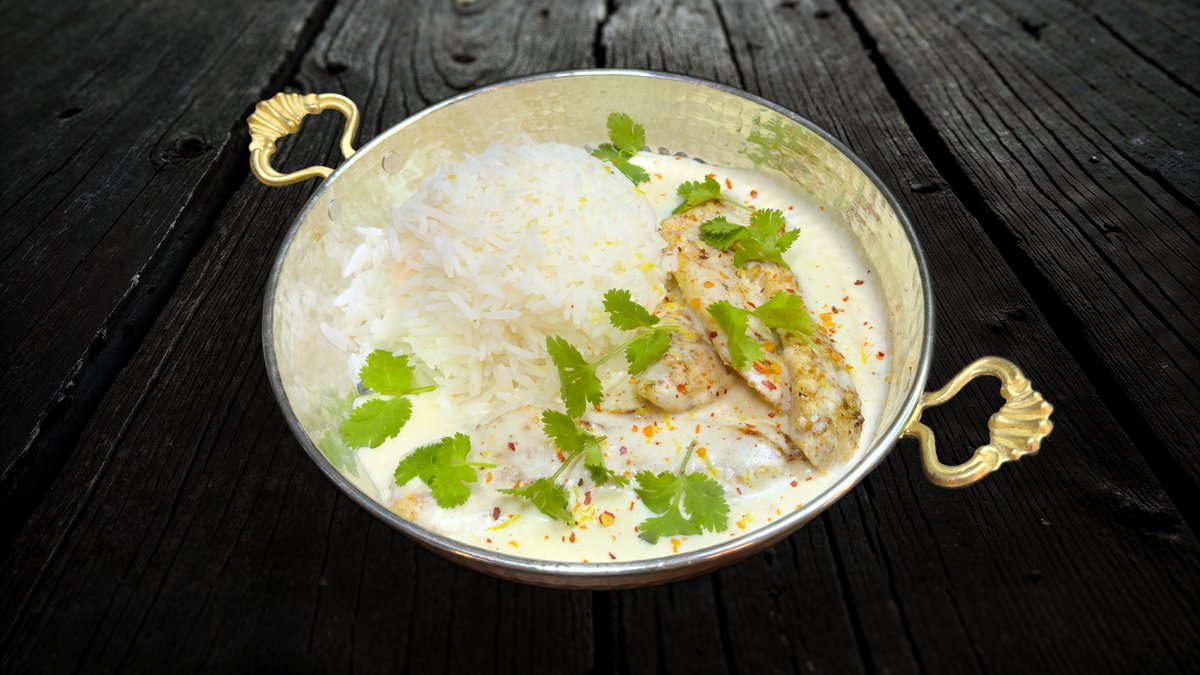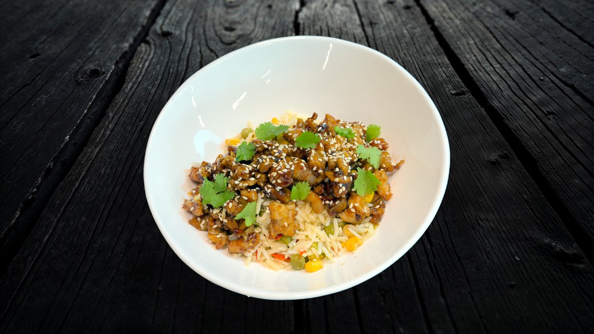 სოუსით ტკბილი ტერიაკით დაფარული წვნიანი ქათმის ფილე, მიირთმევა ფაფუკ ბრინჯთან ერთად.
