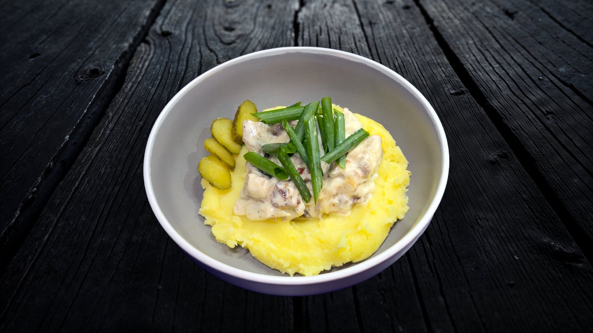 კლასიკური მსუბუქი კერძი, რომელიც შედგება ნაზი ძროხის ხორცისგან, რომელიც მოხარშულია კარაქიან სოუსში ერთად და ჰაეროვანი კარტოფილის პიურედან რძით და კარაქით.
