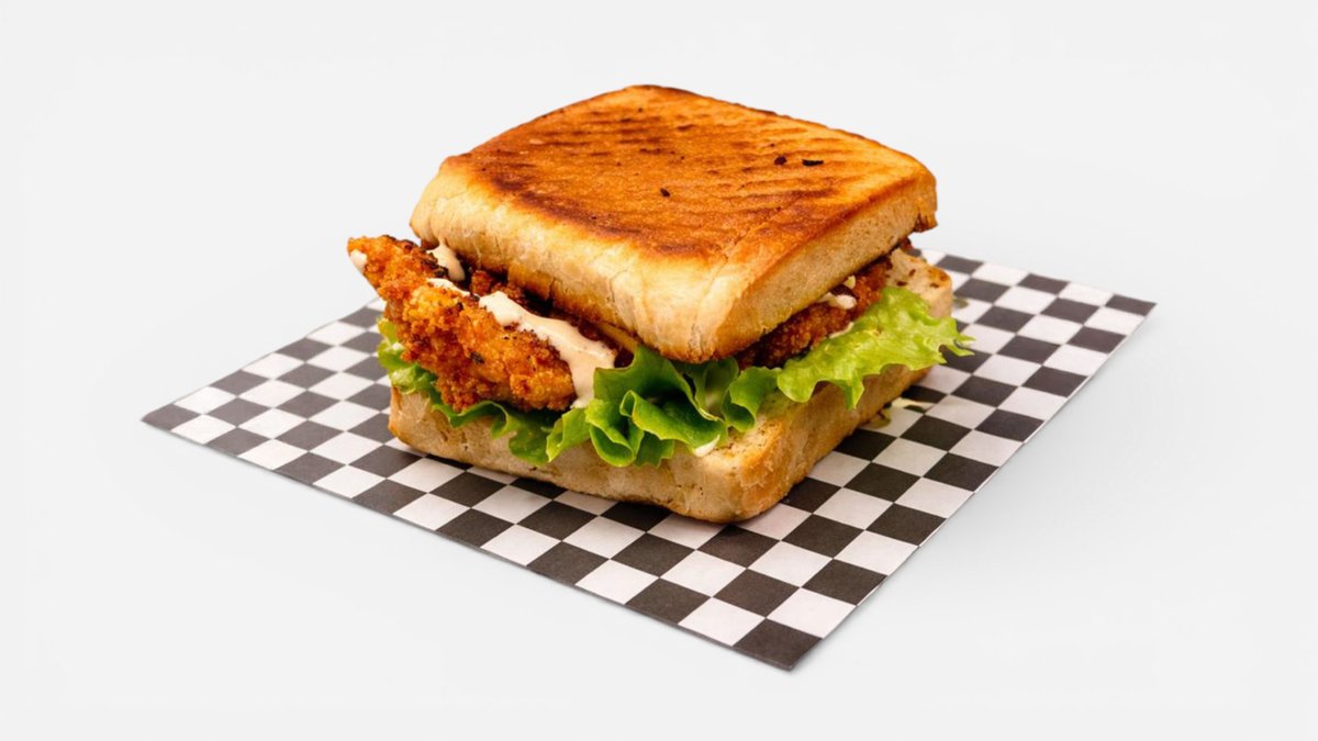 Homemade Hokkaido Bread, Crispy Chicken, Cheddar, Lettuce, Caramelized Onions, Pickles, Special Sauce