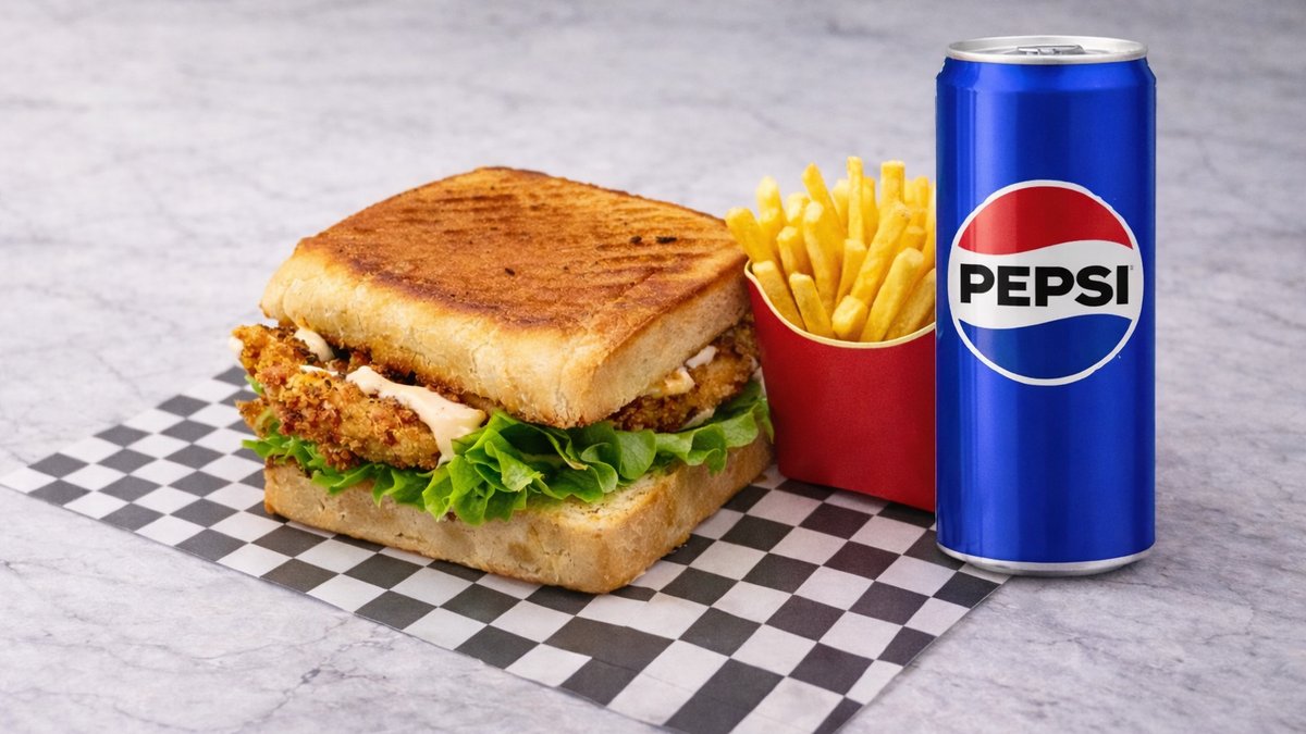 Homemade Hokkaido Bread, Crispy Chicken, Cheddar, Lettuce, Caramelized Onions, Pickles, Special Sauce + Potatoes + Drink