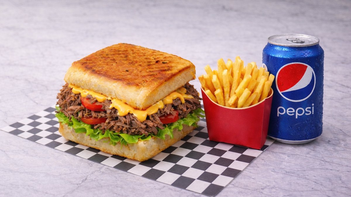 Homemade Hokkaido Bread, Beef, Cheddar, Tomato, Pickles, Lettuce, Caramelized Onions, Special Sauce + Spicy Potatoes + Drink