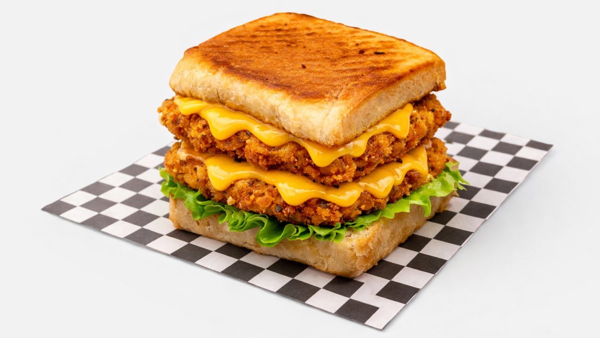 Homemade Hokkaido Bread, Crispy Double Chicken , Double Cheddar , Lettuce, Caramelized Onions, Pickles, Special Sauce
