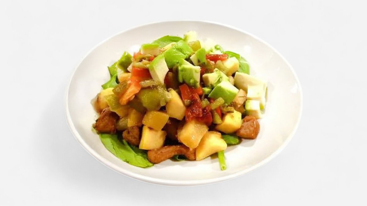 Tender smoked salmon and ripe avocado, combined with crunchy vegetables and a sweet-and-sour honey-mustard dressing. A perfect light and refreshing choice. Avocado (100g), Smoked Salmon, Bell Pepper (40g), Cucumber (50g), Red Onion (30g), Iceberg Lettuce and Arugula (80g), Sesame Seeds (10g), Soy Sauce (30ml), Vegetable Oil (20g), Mustard (10g), Honey (15g), Marinated Onion.