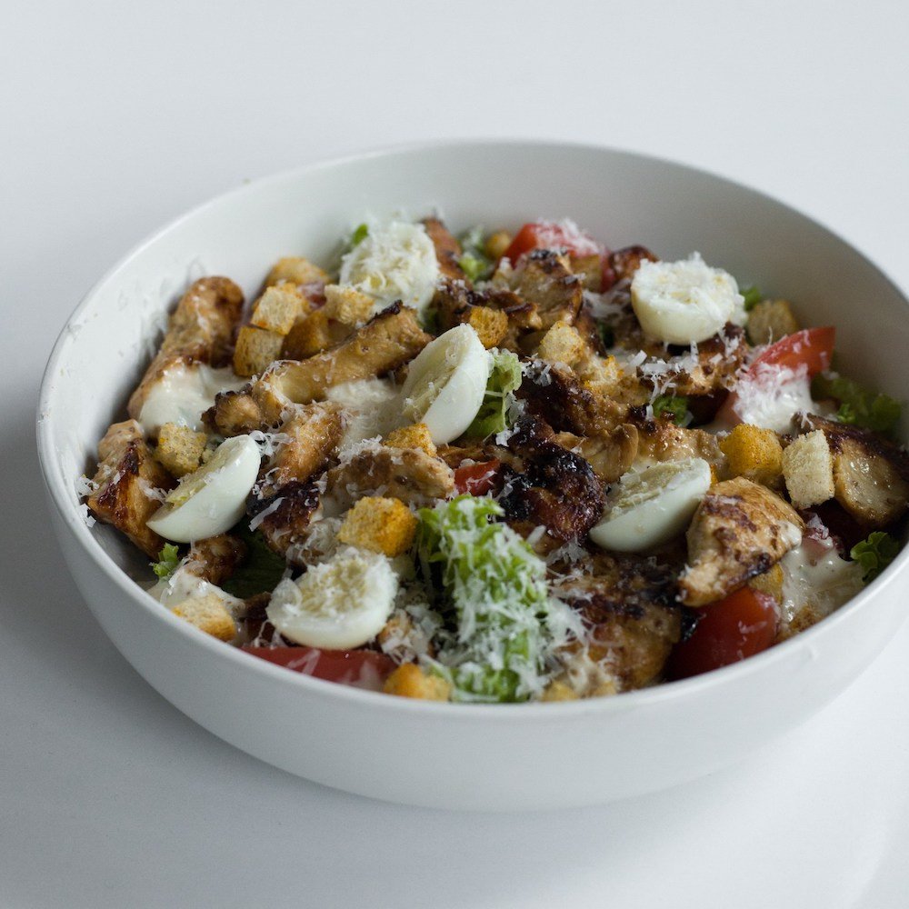 Chicken, caesar sauce, boiled egg, lettuce, tomatoes, parmesan, toast