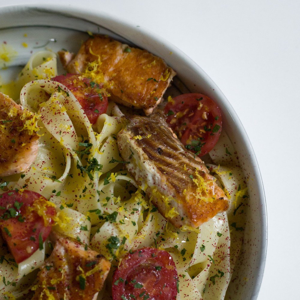 Tagliatelle, salmon, cherry tomatoes, tomato salsa, parsley, butter, salt, lemon zest