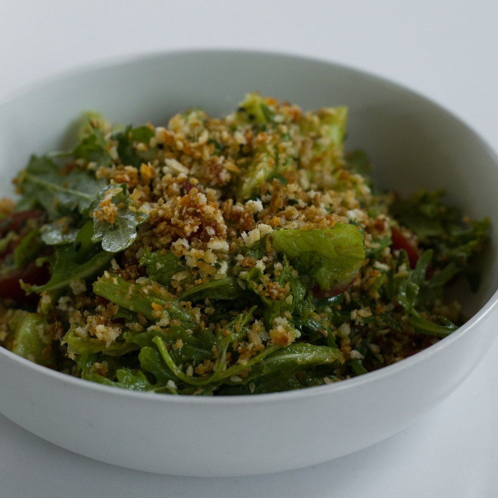 Cherry tomato, avocado, cucumber, lettuce, arugula, chuka, olive oil, lime juice, salt, sesame, sriracha crumble