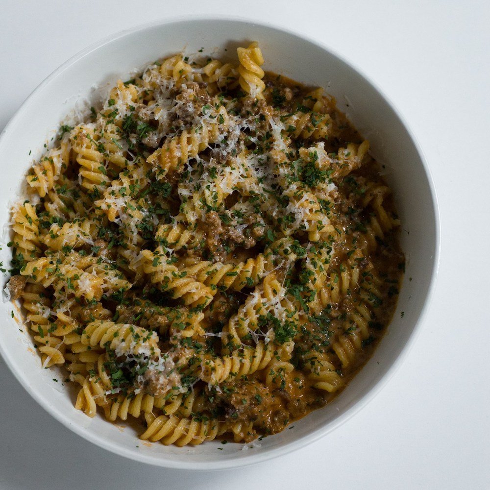 Fusilli, bolognese sauce, tomato sauce, salt, black pepper, parmesan, cream cheese