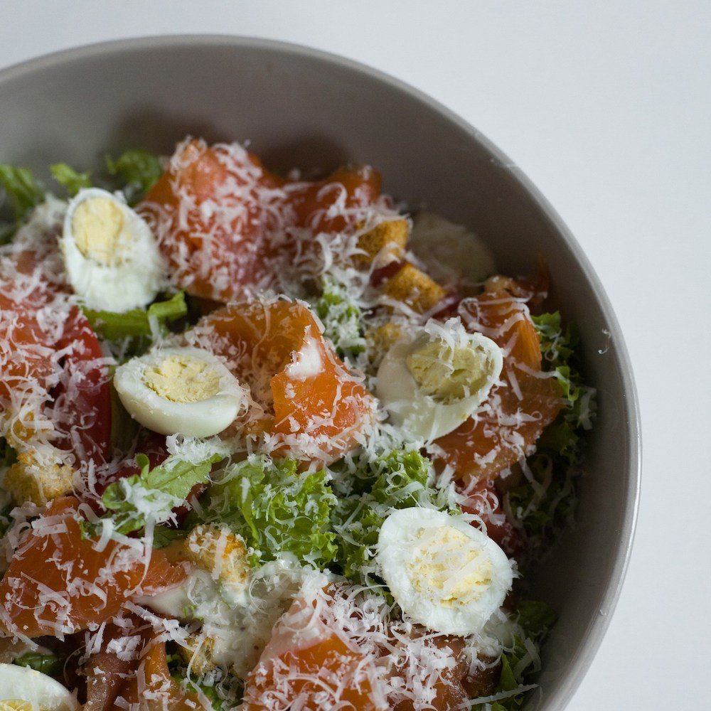 Salmon, caesar sauce, boiled egg, lettuce, tomatoes, parmesan, toast