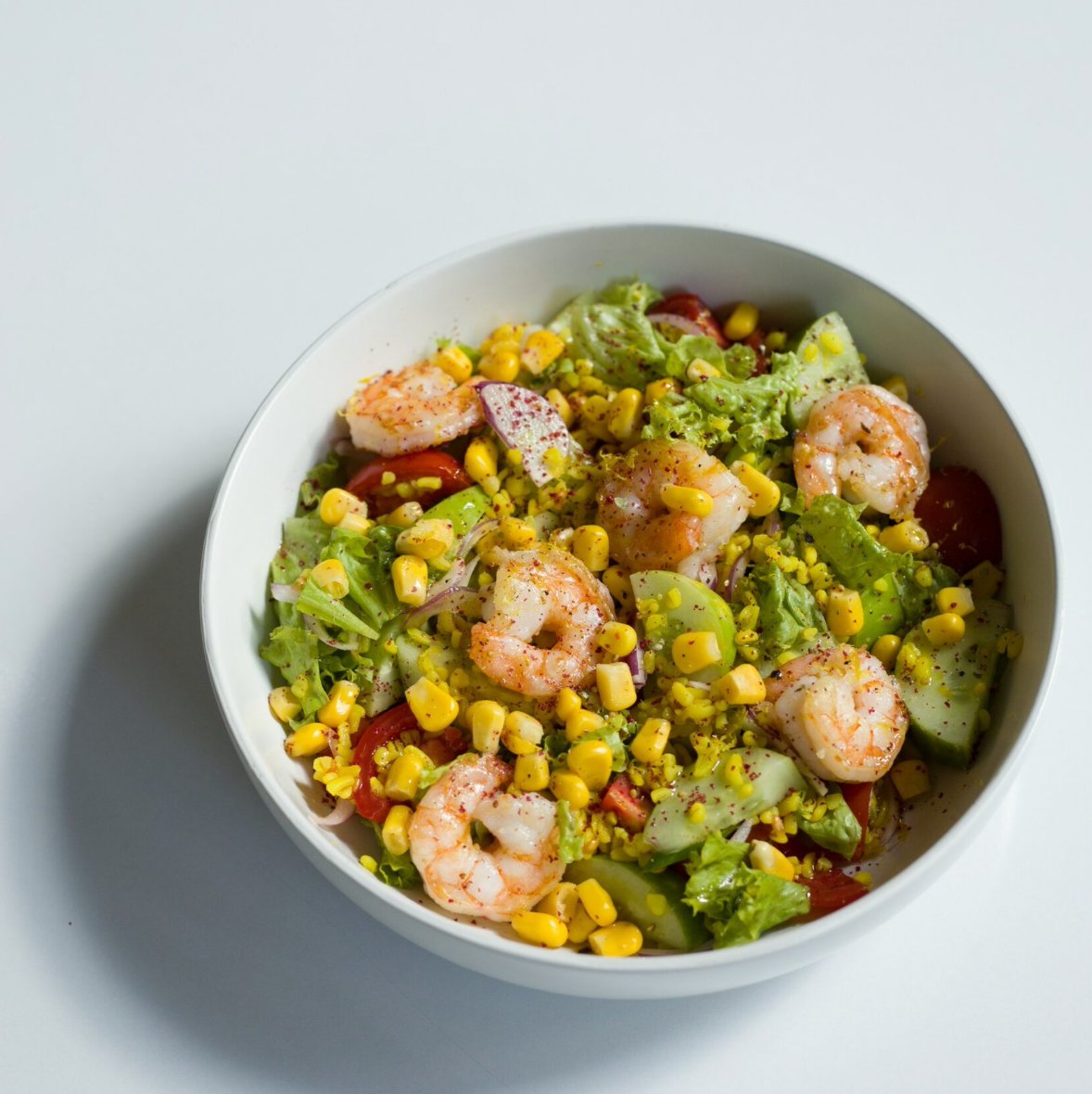 Shrimp, canned corn, cucumber, avocado, lettuce, bulgur, cherry tomatoes, honey lime dressing, red onion
